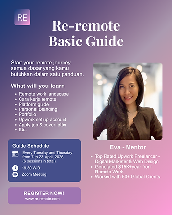Re-remote Basic Guide adalah panduan fundamental untuk kamu yang ingin memulai karier remote dari nol. Program ini membantu kamu memahami dasar-dasar penting seperti platform, personal branding, hingga cara apply job dengan lebih percaya diri.